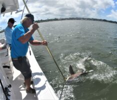 Several fishing seasons ago I was tarpon fishing with Hugh Stone and his grandson Hugh Stone III, when Hugh hooked a large hammerhead shark. After a four hour battle, Hugh finally landed a 500-lb., 14-foot hammerhead shark which is still one of the largest sharks ever landed off from Amelia Island.